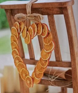 Für das Herz zunächst aus Karton eine Schablone schneiden und die getrockneten Orangenscheiben so darauf anordnen, dass sie sich zu etwa einem Drittel überlappen. Nun mit Heißkleber aneinanderheften. Dabei setzt man die Klebepunkte an den Rändern, wo die Schalen aufeinandertreffen.